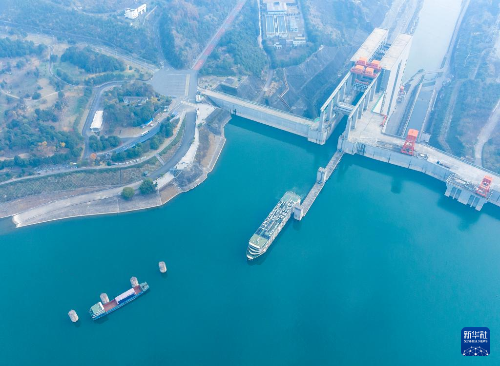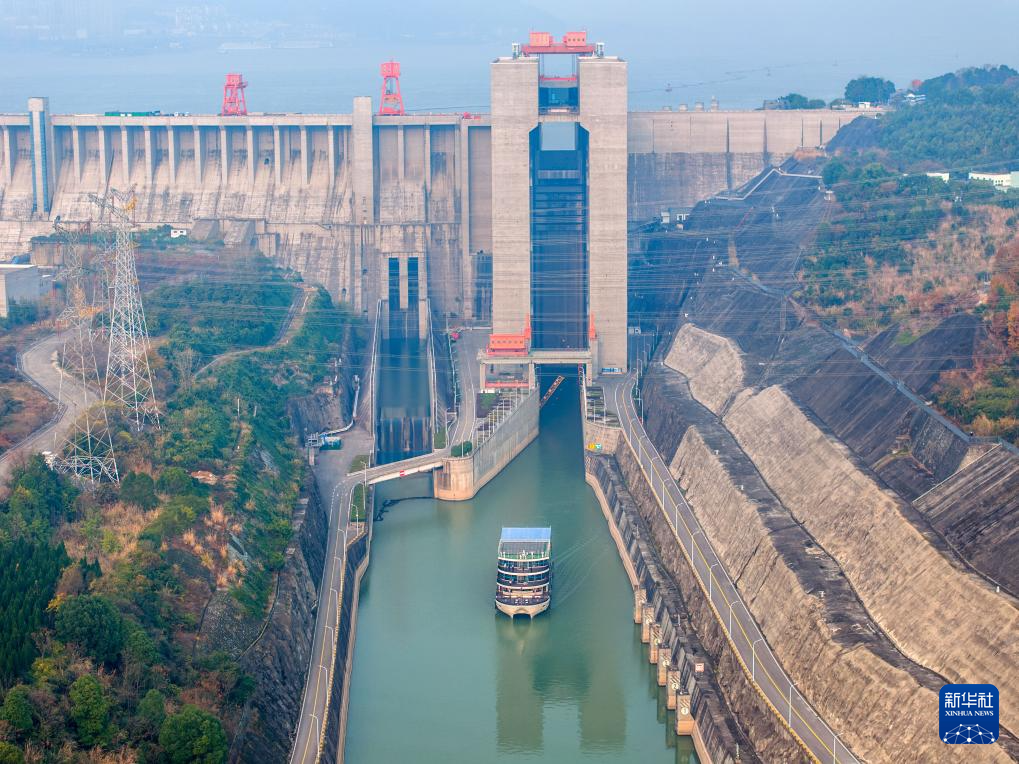 12月20日,在湖北省宜昌市,一艘轮船正在通过三峡升船机下行(无人机照片)。