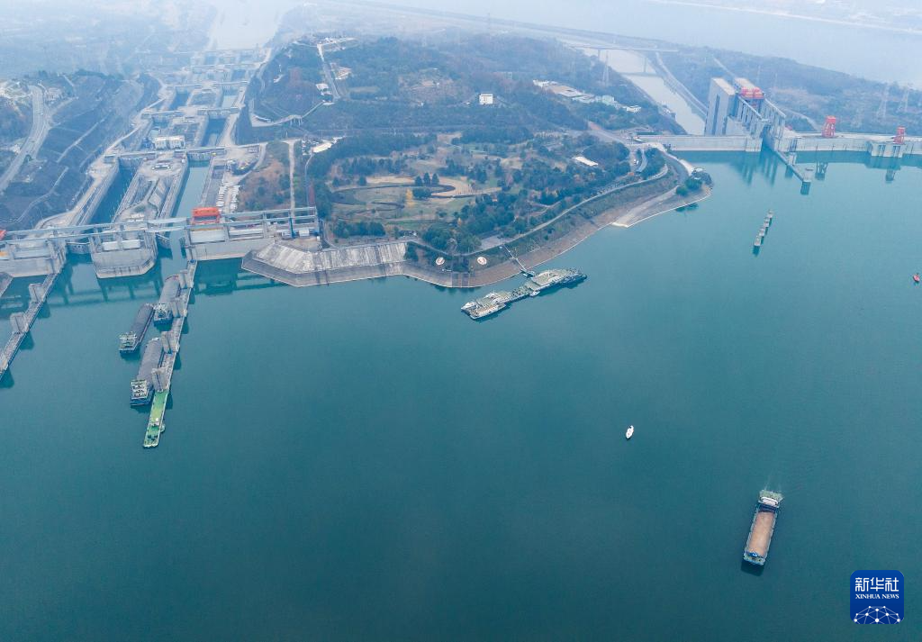 12月20日,船舶有序通过三峡五级船闸和三峡升船机(无人机照片)。