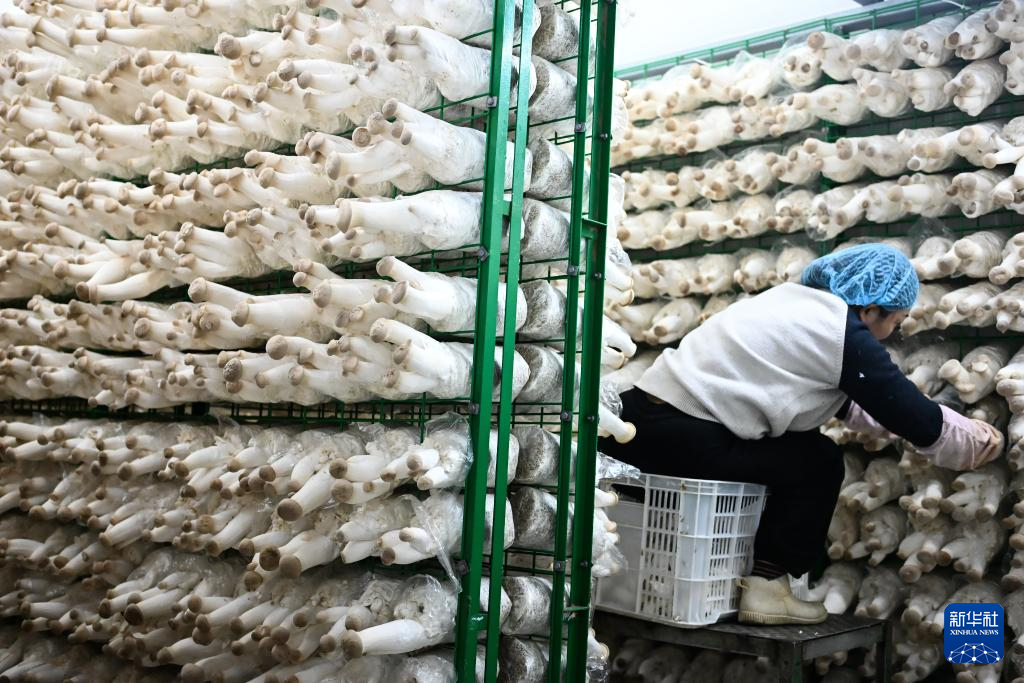 12月21日,在盐城市大丰区久禾生物科技发展有限公司,工人在采收杏鲍菇。