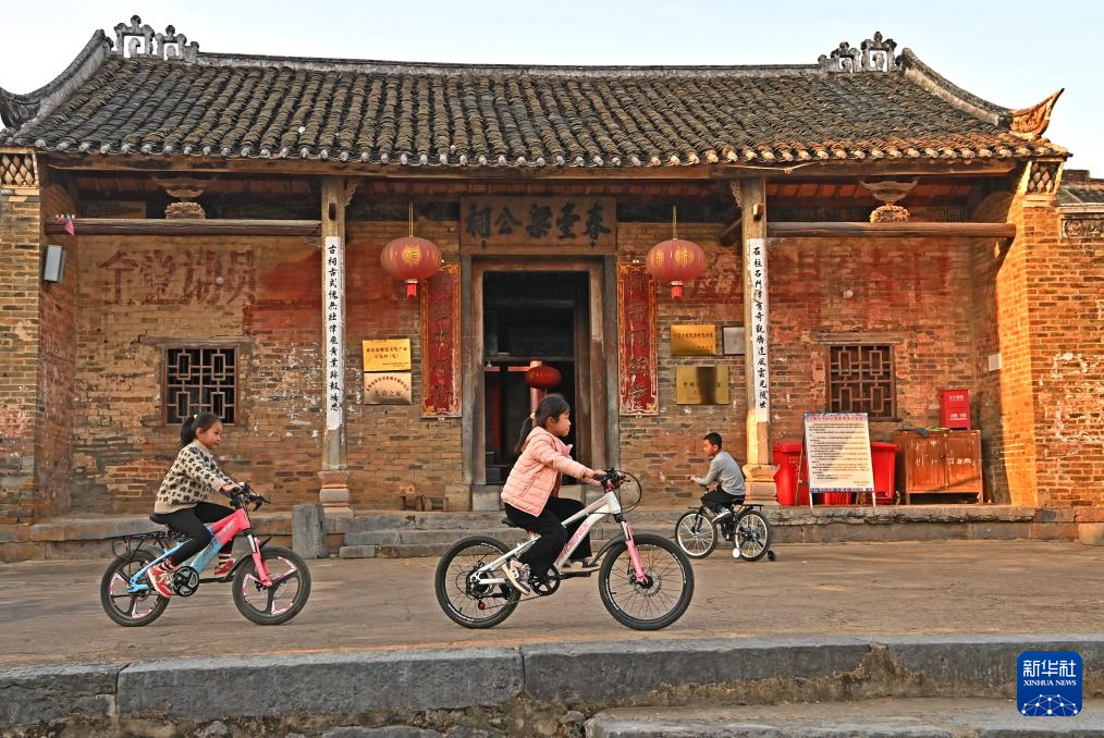 金秀县桐木镇那安村龙腾屯的孩子们在骑自行车(12月18日摄)。