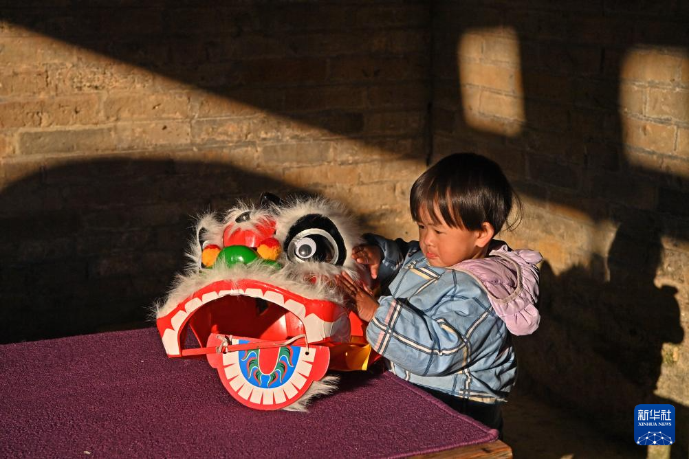 金秀县桐木镇那安村龙腾屯两岁的小朋友梁柔玥在抚摸“狮头”(12月19日摄)。