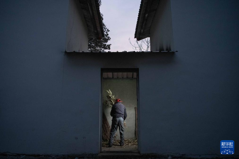 11月23日,在安徽省铜陵市义安区天门镇五峰村,“姜把式”盛义武的父亲盛昌春在姜阁下方帮忙生火,为存放其中的姜种增温保暖。