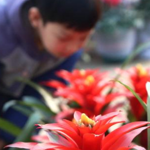 12月22日,小朋友在山东省高密市一家花卉市场赏花。