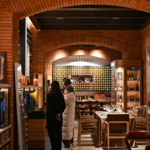 12月24日,游客在位于宁夏银川市的图兰朵葡萄酒小镇参观葡萄酒廊。