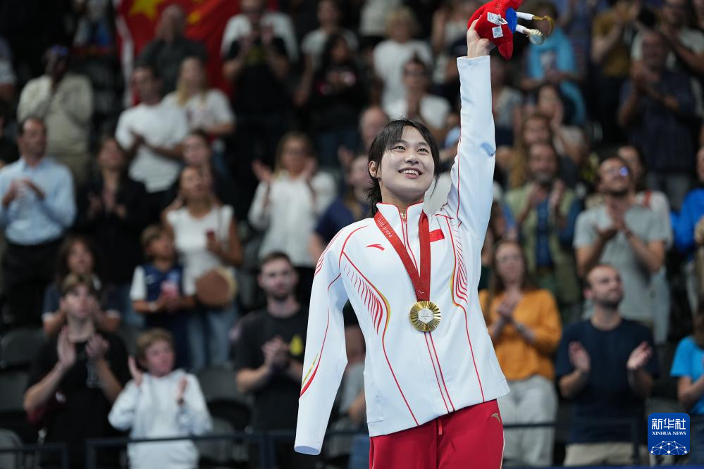 这是2024年9月4日,冠军中国选手蒋裕燕在巴黎残奥会游泳女子100米自由泳S7级颁奖仪式上向观众致意。