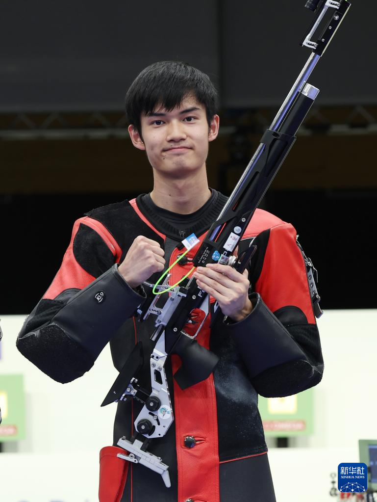 这是2024年7月29日,中国选手盛李豪在巴黎奥运会射击男子10米气步枪决赛后庆祝夺冠。