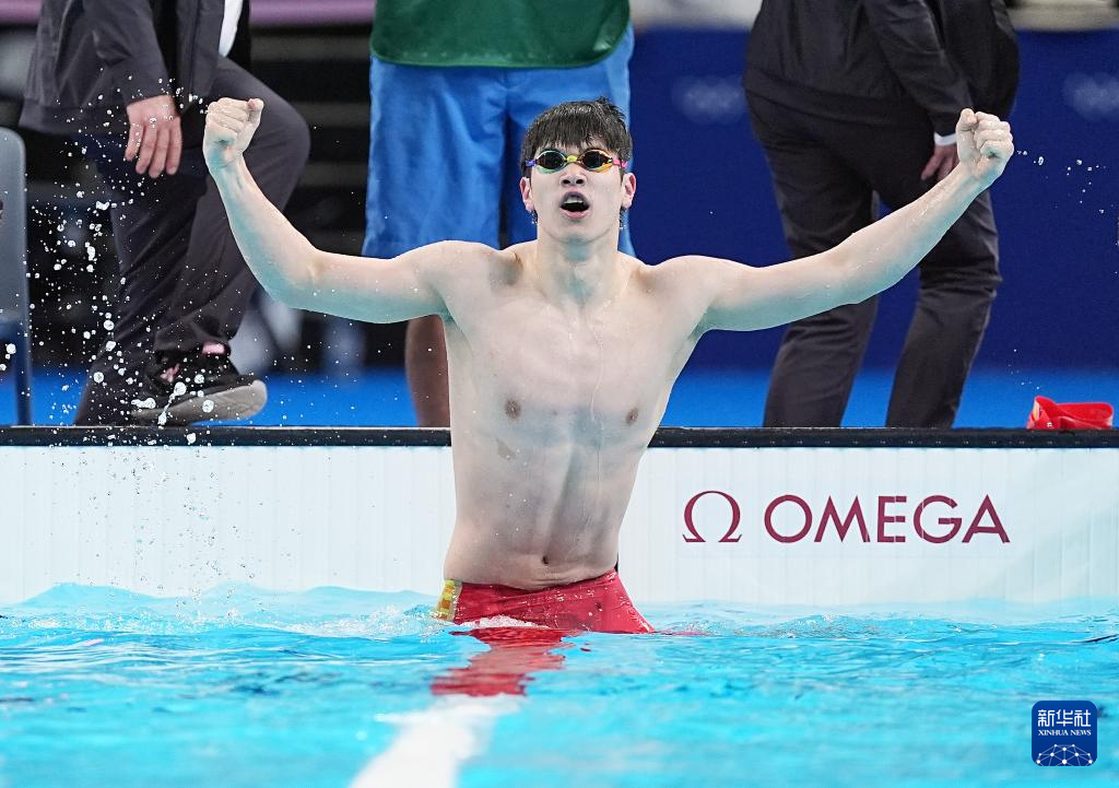 这是2024年7月31日,中国选手潘展乐在巴黎奥运会游泳项目男子100米自由泳决赛后庆祝。
