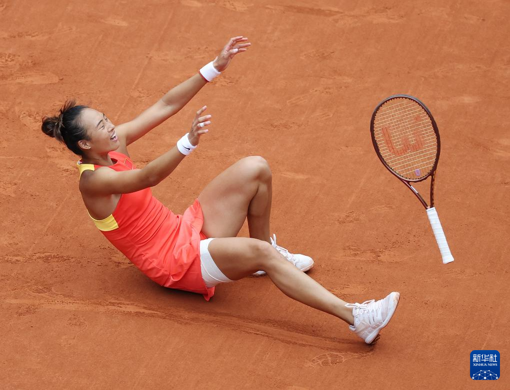 这是2024年8月3日,中国选手郑钦文在巴黎奥运会网球女单决赛后庆祝。郑钦文2比0战胜克罗地亚选手维基奇,夺得金牌。