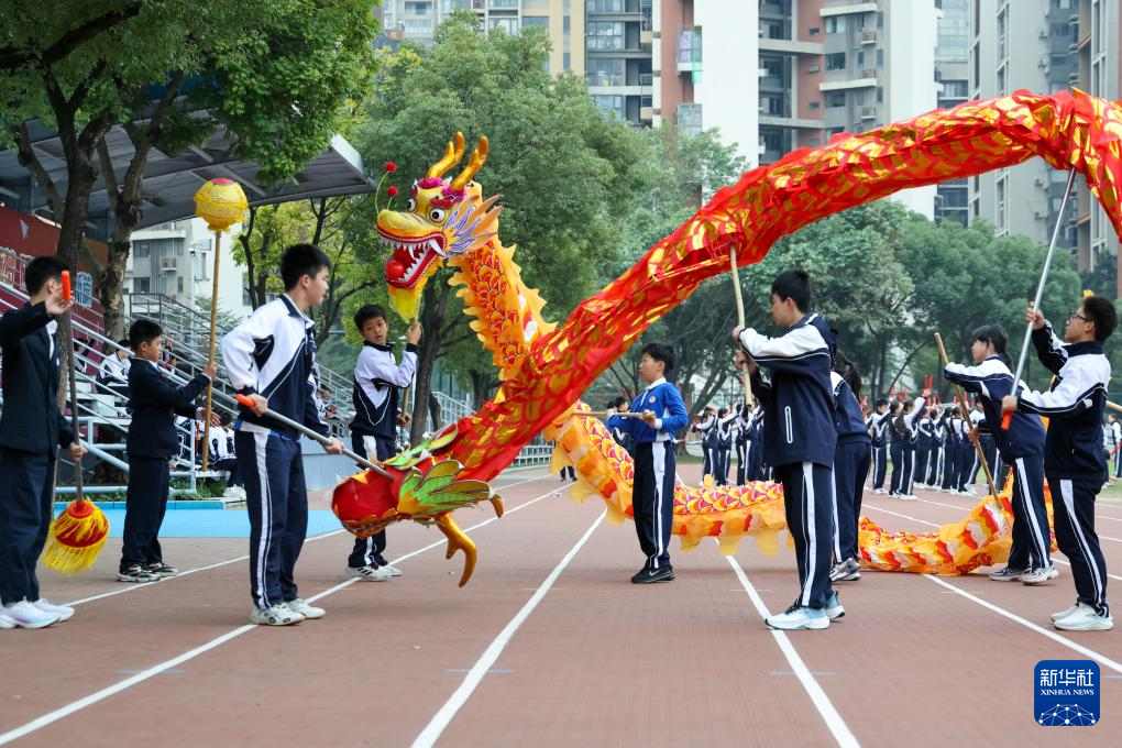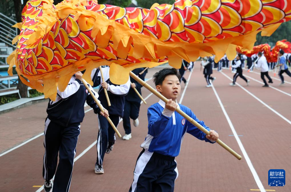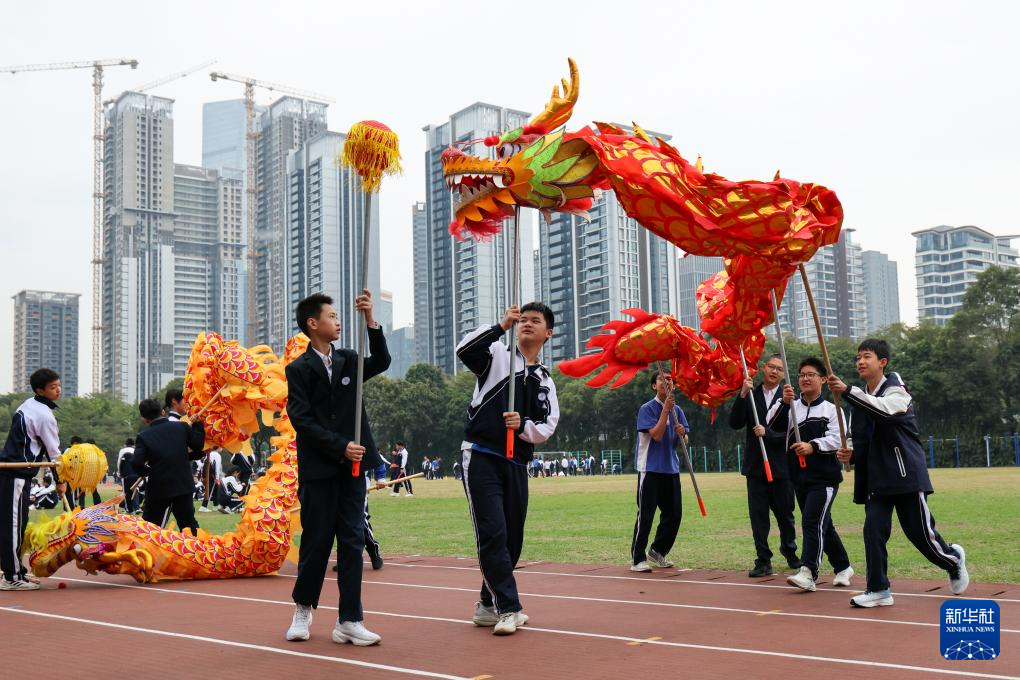 12月23日,深圳大学附属中学初中部的学生们在体育课上学习舞龙。