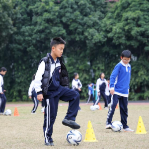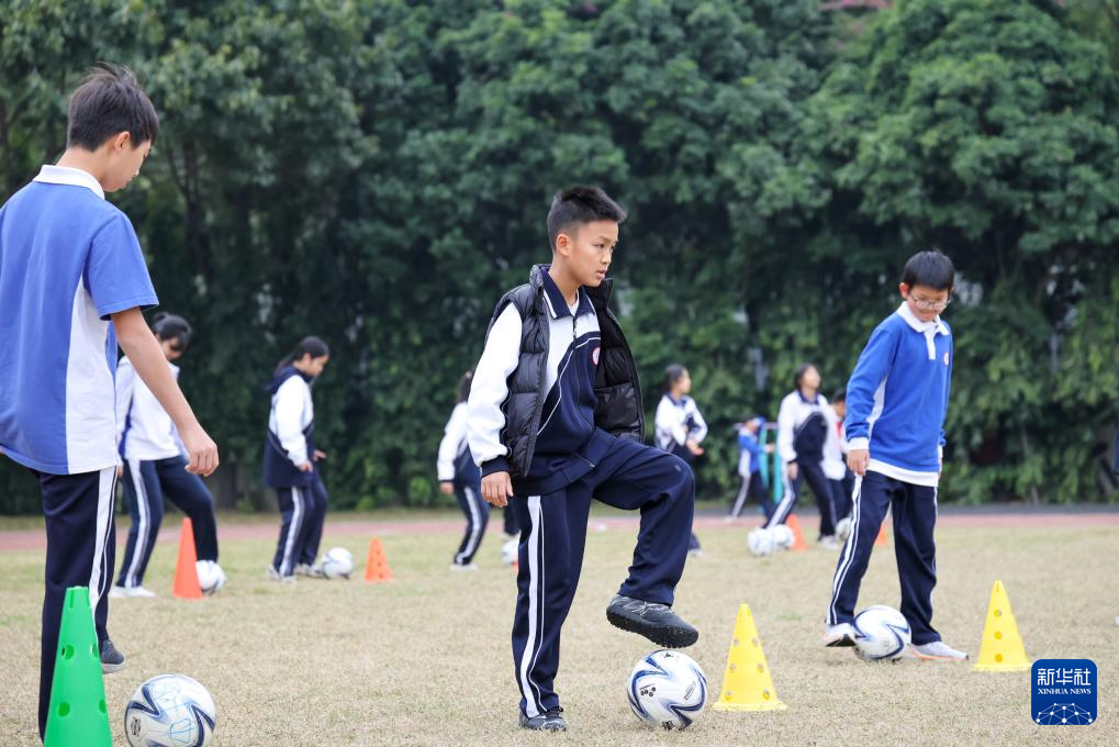 12月23日,深圳大学附属中学初中部的学生们在体育课上练习足球。