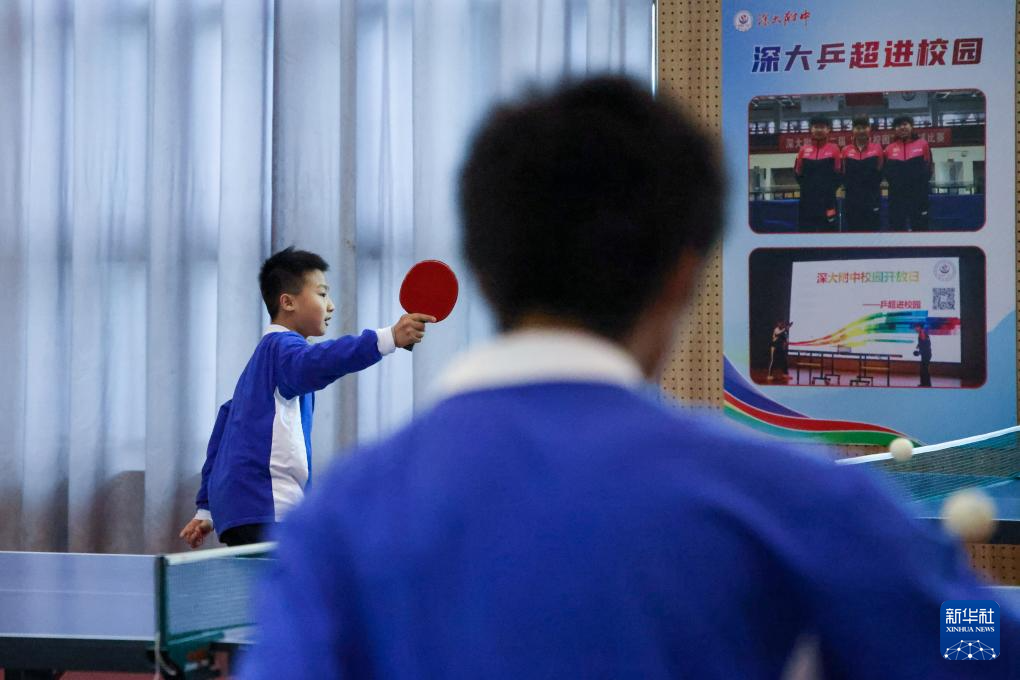 12月23日,深圳大学附属中学初中部的学生们在体育课上练习乒乓球。