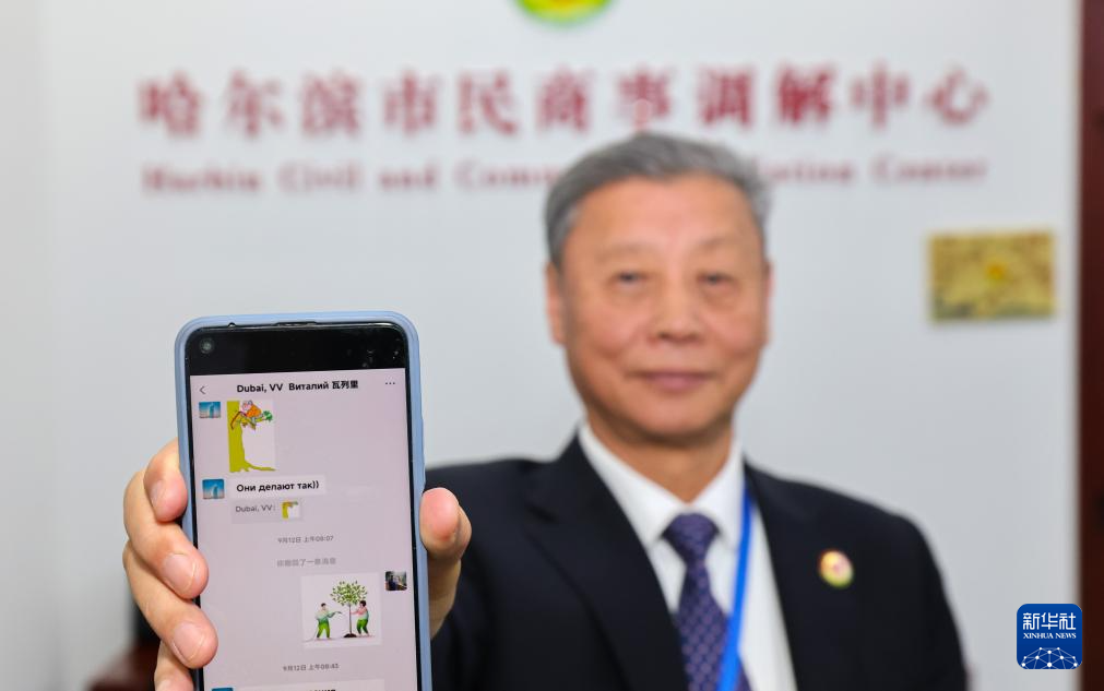 12月9日,哈尔滨市民商事调解中心王源泉在展示与外籍人员的调解过程。