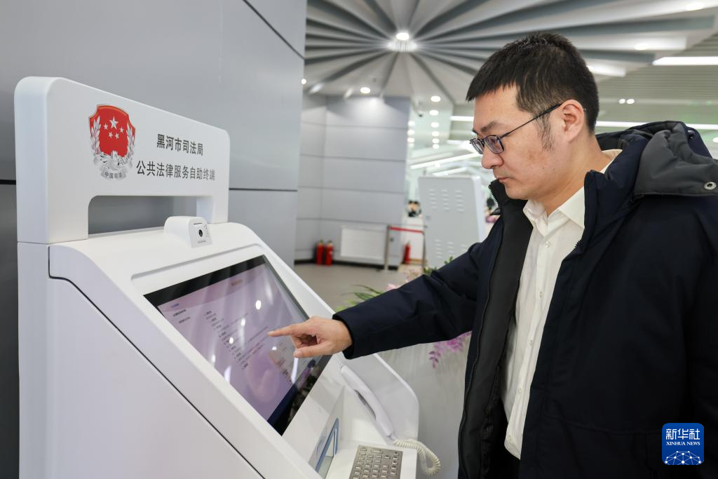 12月11日,一名男子在黑龙江省黑河市司法局公共法律服务自助终端上办理业务。