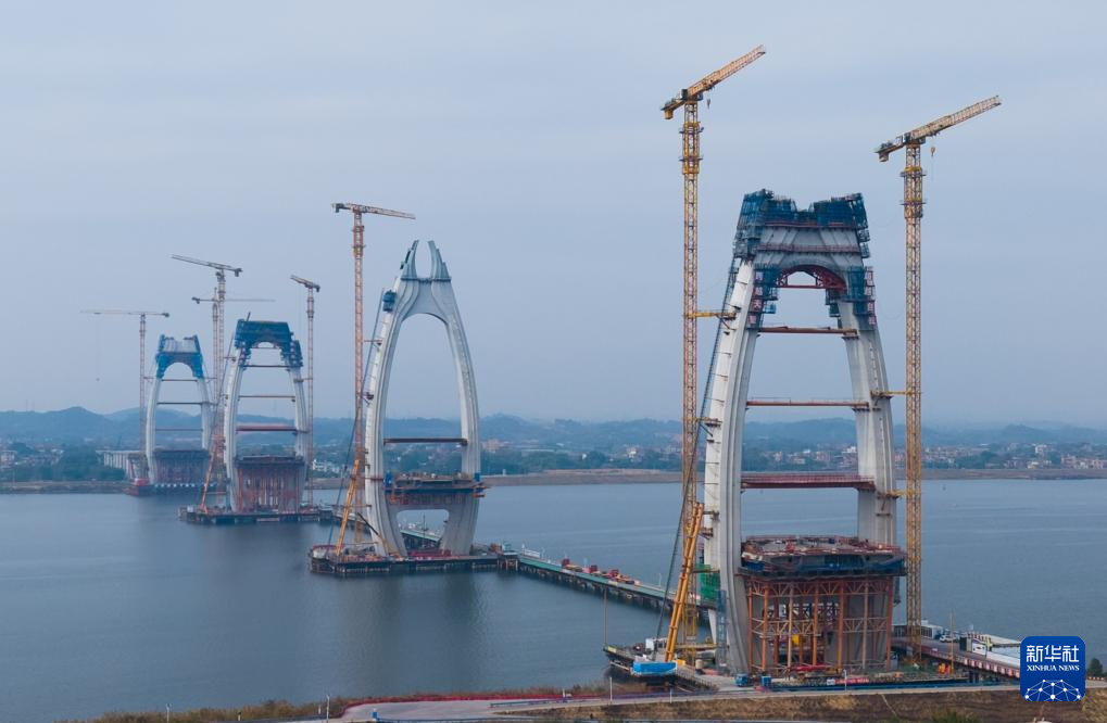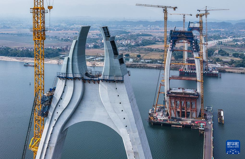 这是12月25日拍摄的清花高速北江特大桥封顶的主塔(右二)(无人机照片)。