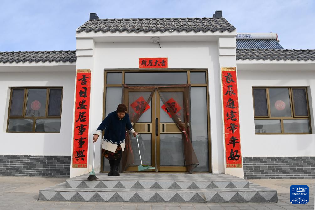 12月25日,在金塔县金塔镇营泉村集中安置点,村民打扫自家卫生。