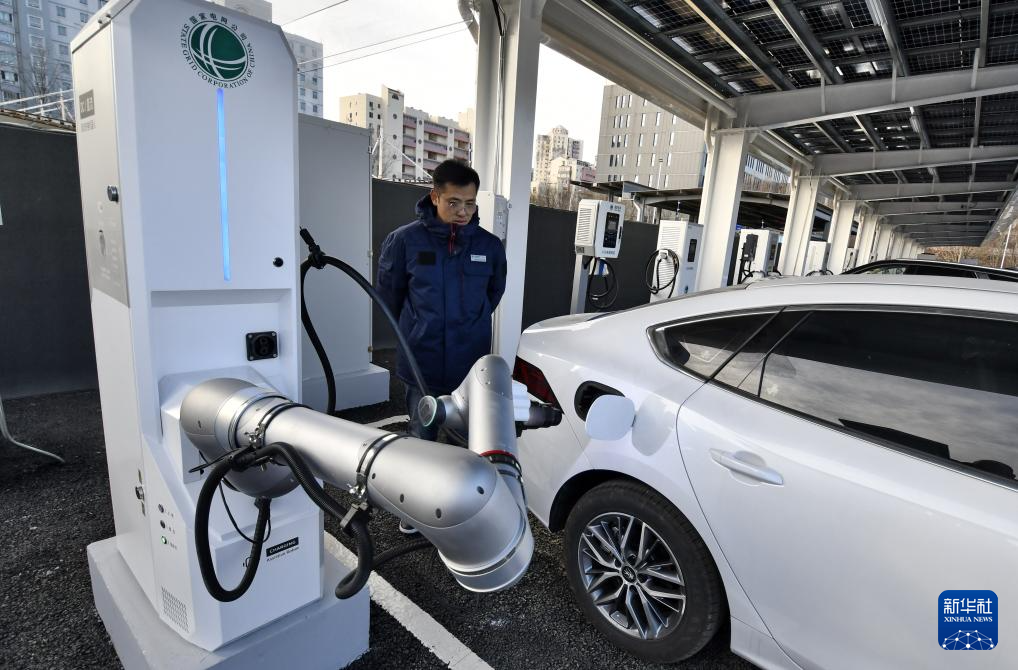 12月26日,在智慧绿色充换电站内,拥有六轴智能机械臂的全自动智能充电机器人在为电动汽车充电。