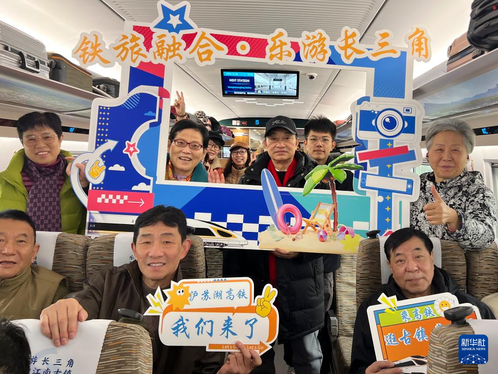 12月26日,上海虹桥至浙江安吉的G9501次列车乘客在车厢内打卡留念。这趟列车也是沪苏湖高铁开通首日首趟“乐游长三角·新韵江南古镇”品牌旅游列车。