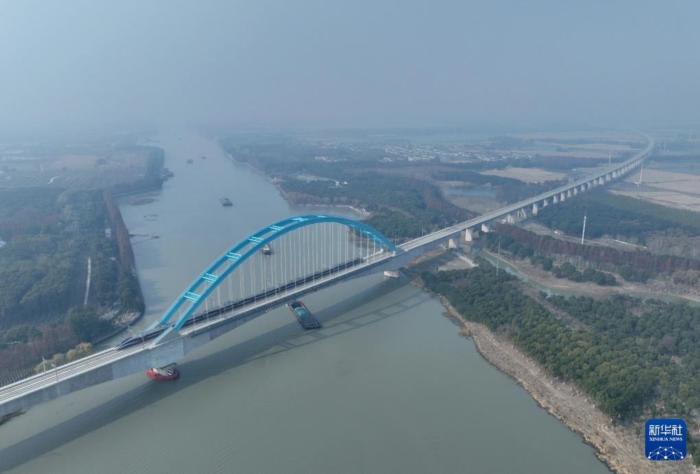 12月26日,列车驶过沪苏湖高铁青浦特大桥跨太浦河连续梁拱(无人机照片)。