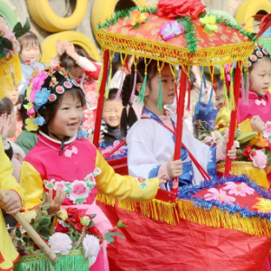 12月27日,浙江省湖州市德清县莫干山镇中心幼儿园的孩子们在表演非遗“十样景灯”。