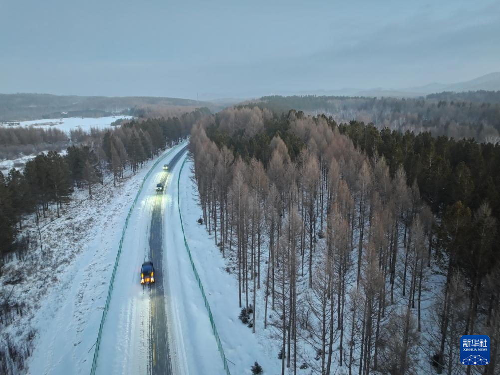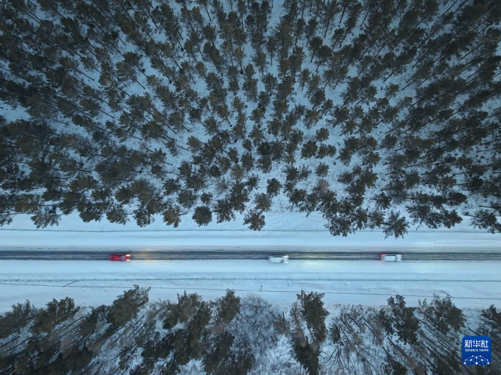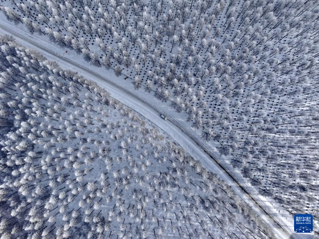 12月27日,汽车在塞罕坝机械林场内行驶(无人机照片)。