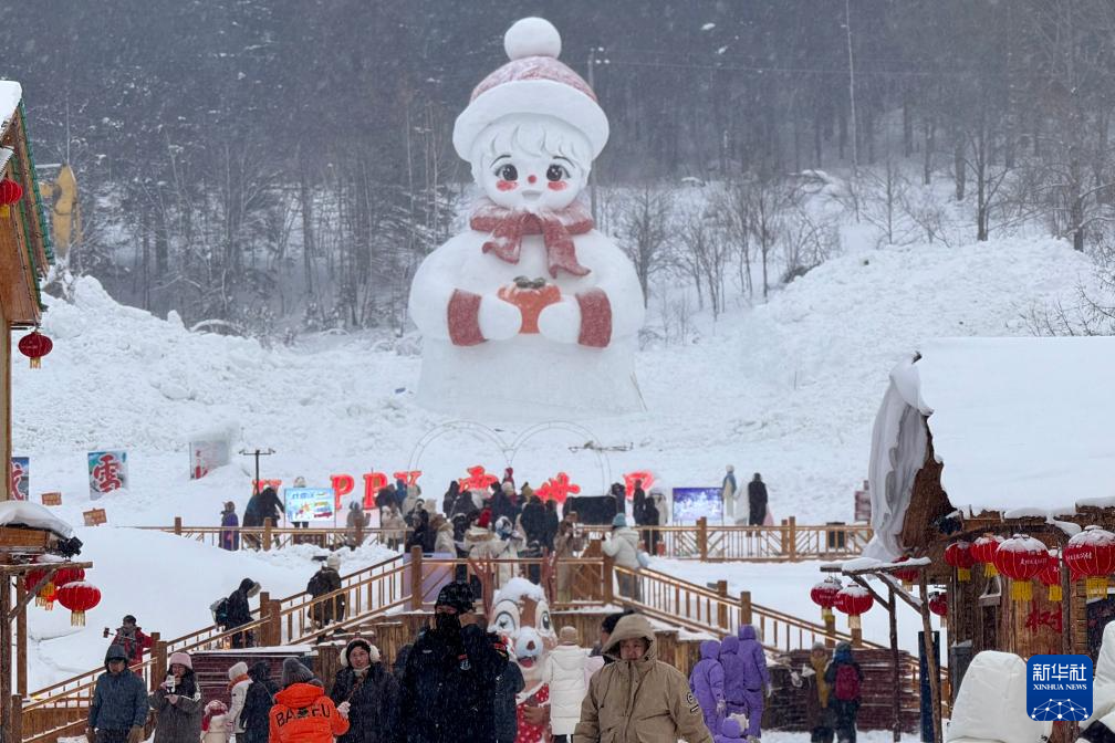景区内木屋错落有致,绵密积雪覆盖房顶,形成独特的“蘑菇屋”。游客在此赏雪、拍照、游玩,感受东北民俗,尽享冬日快乐。