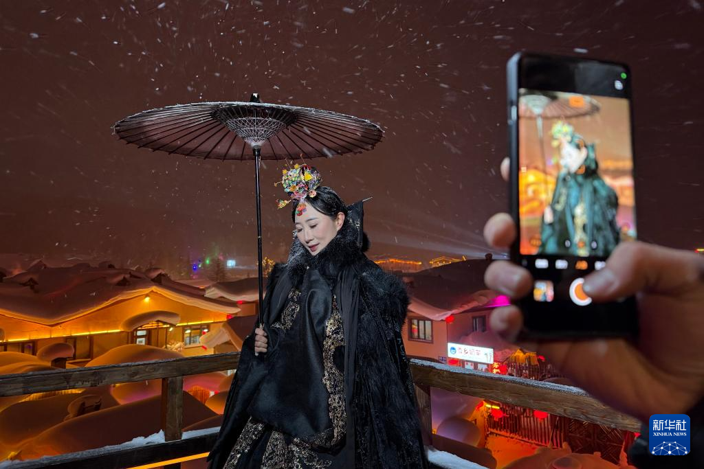 ,12月28日,游客在“中国雪乡”景区体验旅拍。