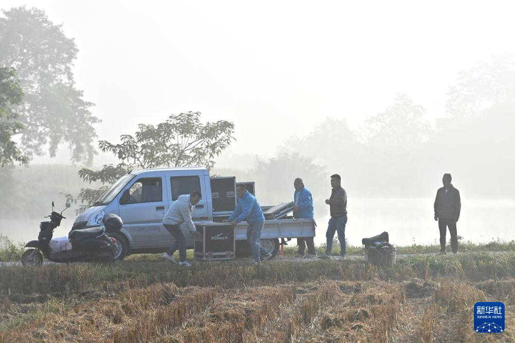 那造村村民在搬运音响设备,准备举办首届稻田文化艺术节(10月30日摄)。