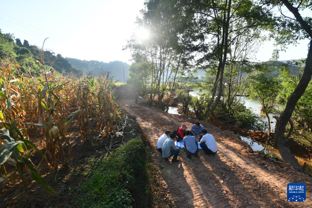 在那造村河道整治项目建设现场,驻村第一书记蒋士圳(右一)和同事们在研究施工方案(10月31日摄)。