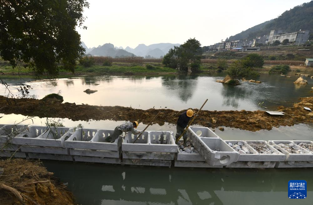 在那造村河道整治项目建设现场,工人在施工(12月23日摄)。