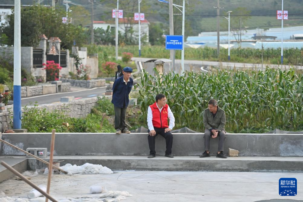 那造村驻村第一书记蒋士圳(左二)和村民交流(10月30日摄)。