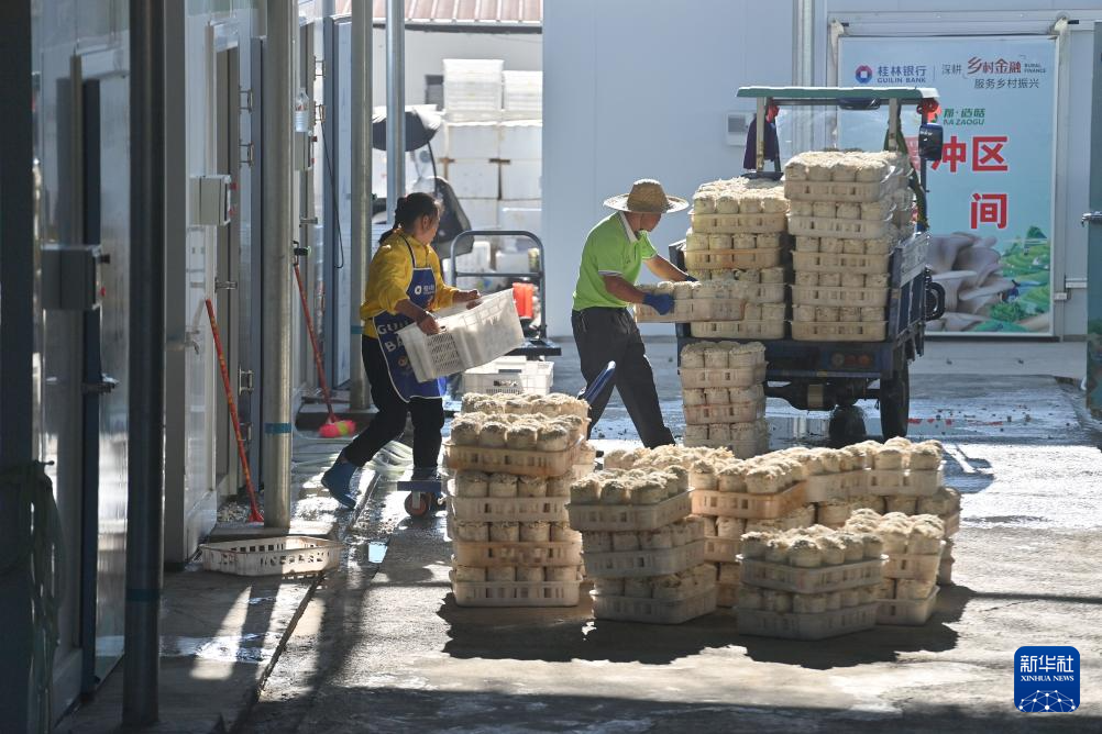 在那造村食用菌生产基地,村民在搬运采摘的蘑菇(10月31日摄)。