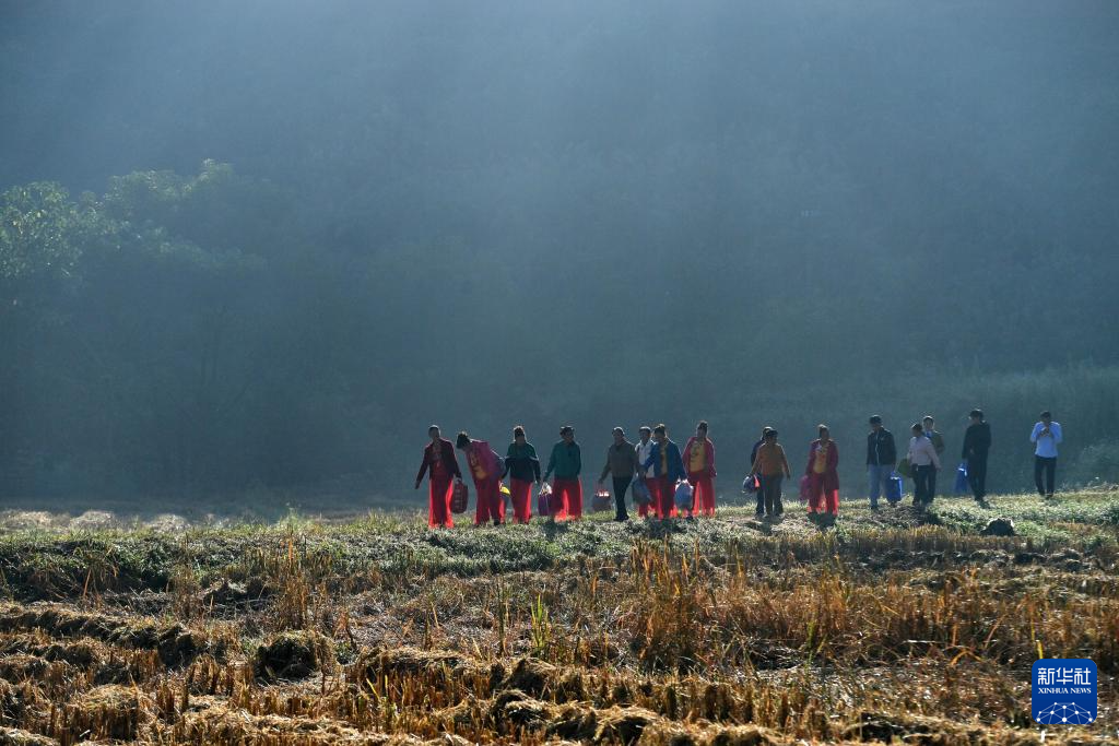 那造村村民们走在田埂上,前去参加首届稻田文化艺术节(10月30日摄)。