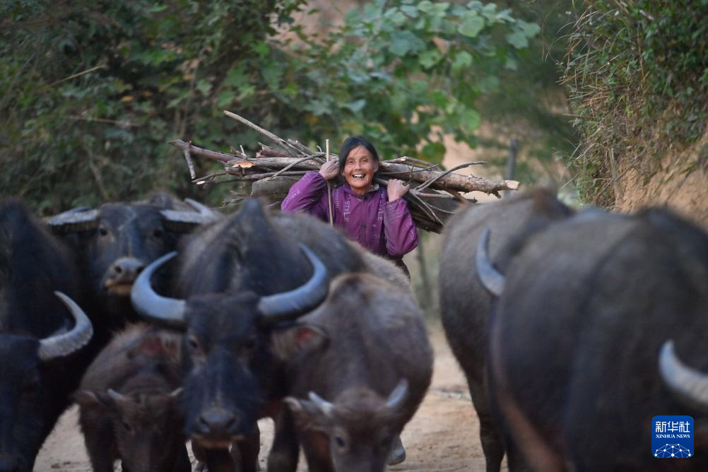 那造村村民李杏伟放牛归来(12月23日摄)。