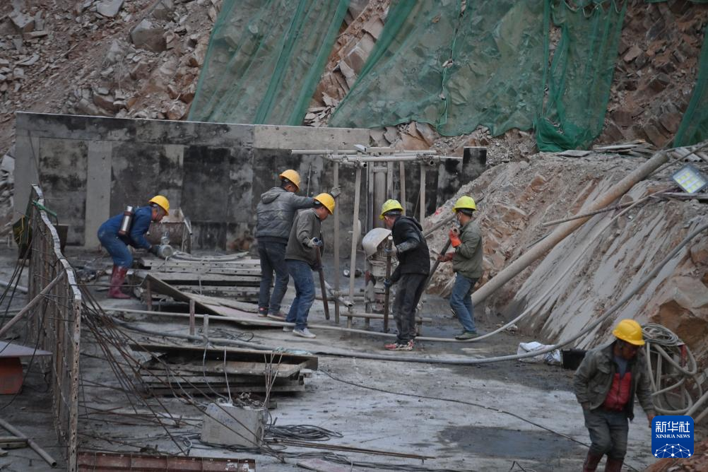 在那造村优质稻产业基地水利灌溉拦水坝项目现场,工人们在施工(12月23日摄)。