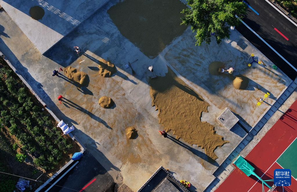 那造村村民在收稻谷(无人机照片,10月30日摄)。