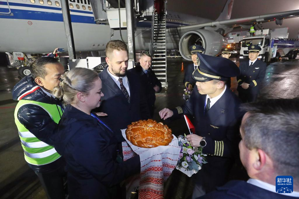 12月28日,在白俄罗斯明斯克国家机场,工作人员用面包和盐欢迎北京-西安-明斯克航线首航机组成员。
