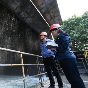 12月30日,在泉州市安溪县,税务人员和福建泉州闽光钢铁有限责任公司工作人员一同查看冷却塔水循环运转情况。