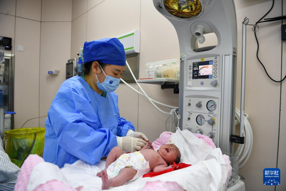 2025年1月1日凌晨,在位于吉林长春的吉林大学白求恩第一医院妇产中心产科,助产士梁平为新生儿检查身体。