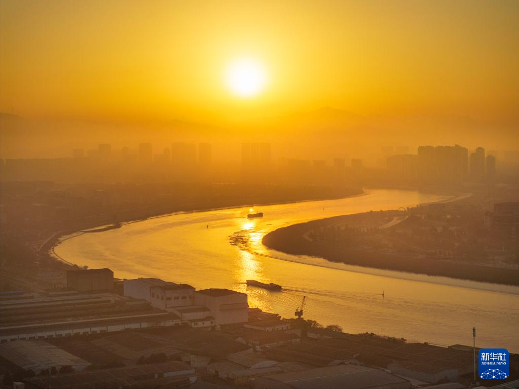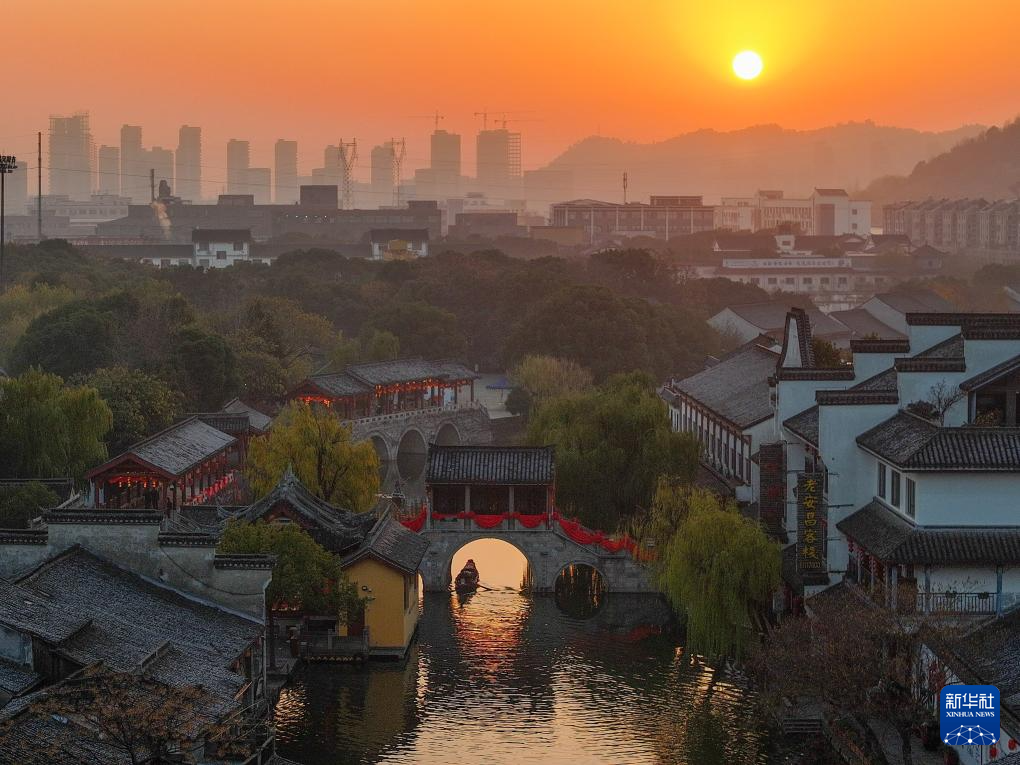 2025年1月1日在浙江省绍兴市柯桥区安昌古镇拍摄的日出景象(无人机照片)。
