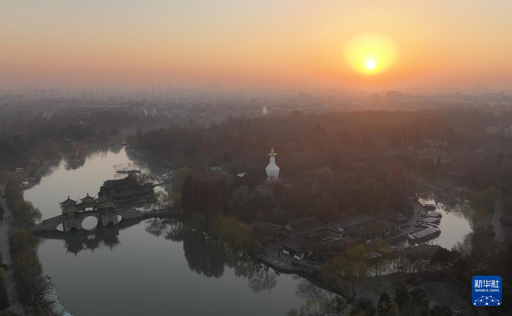 2025年1月1日在江苏扬州瘦西湖景区拍摄的日出景象(无人机照片)。