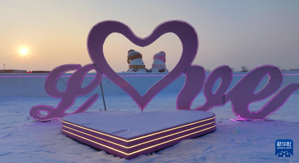 2025年1月1日,黑龙江省哈尔滨市松北区一处冰雪乐园的雪人沐浴在朝阳中(无人机照片)。
