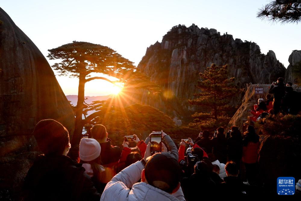 2025年1月1日,游客在安徽黄山风景区迎客松景点观赏日出。