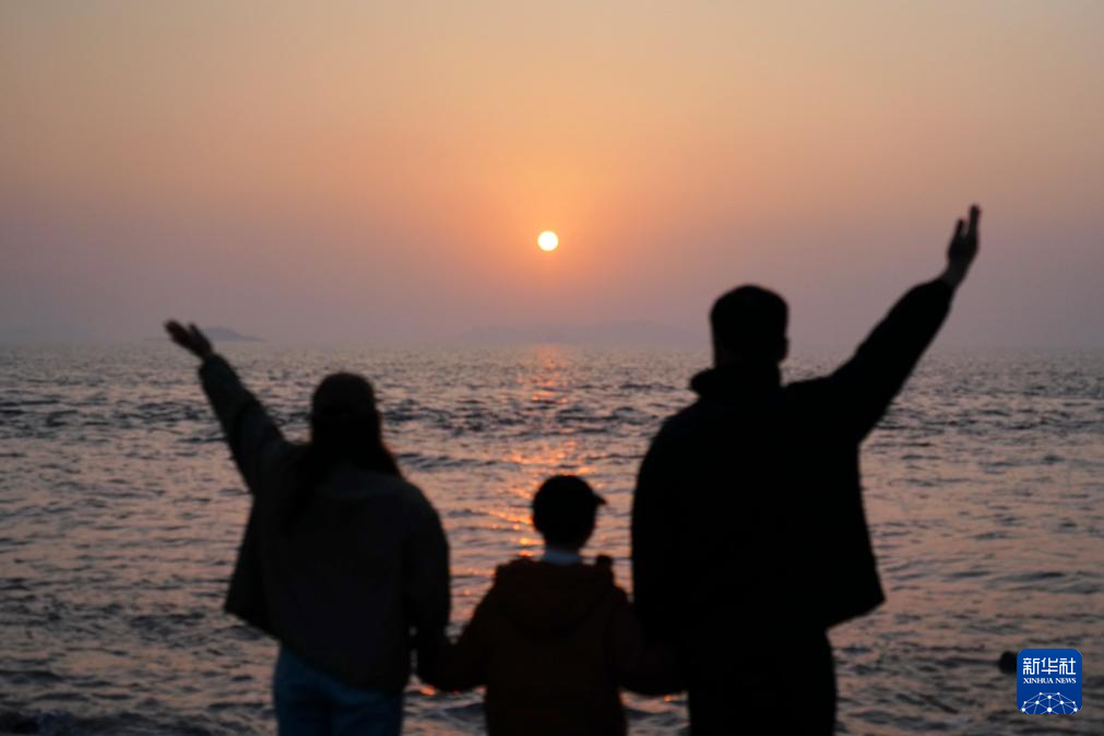 2025年1月1日,一家三口在浙江省瑞安市海滨迎接新年第一缕阳光。