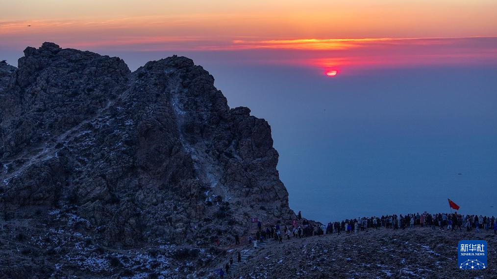 2025年1月1日,人们在宁夏银川市贺兰山滚钟口景区笔架峰观赏日出景色(无人机照片)。
