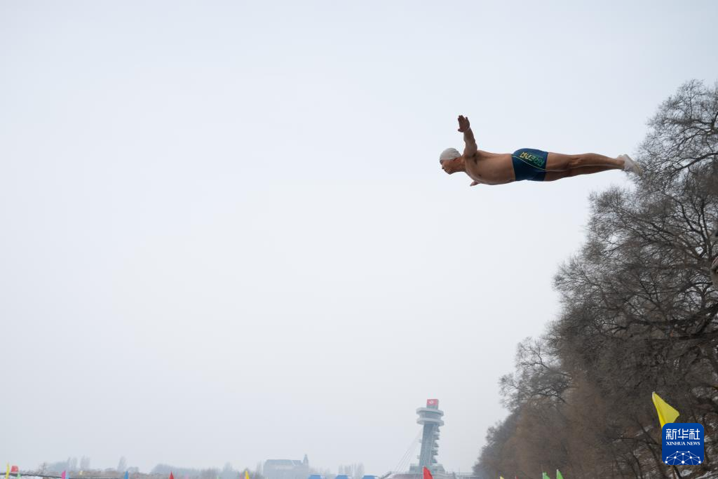 2025年1月1日,冬泳爱好者在哈尔滨中东铁路公园冬泳场跳水。