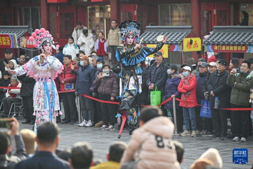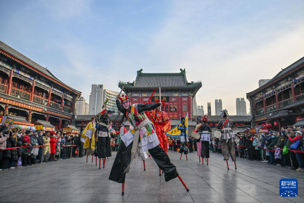 2025年1月1日,在天津古文化街,民俗表演者为游客表演踩高跷。