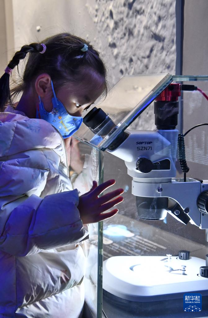 2025年1月1日,在北京天文馆举办的“问月——中国探月工程嫦娥五号月球样品展”,一名小朋友用显微镜观看月球土壤样本。