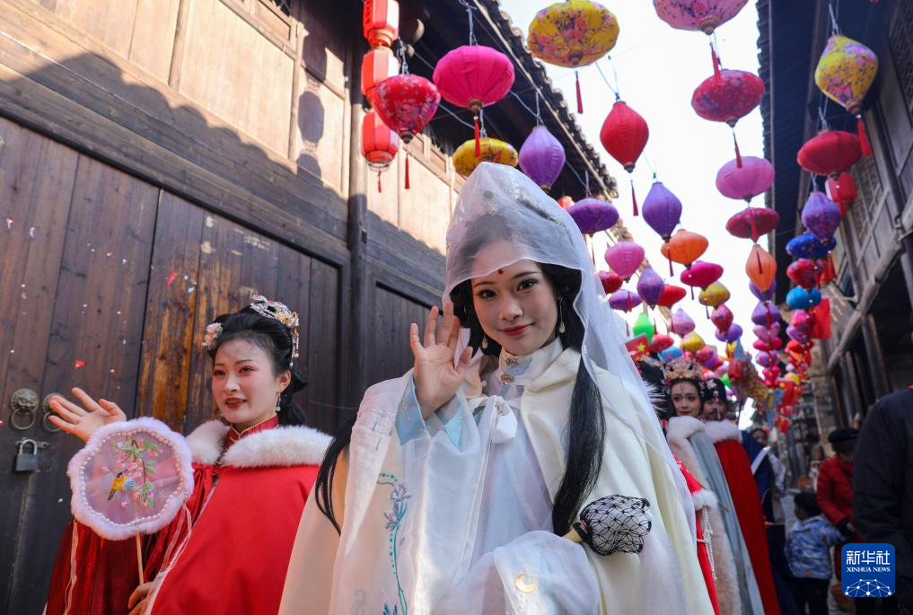 2025年1月1日,汉服爱好者在安徽省宣城市泾县桃花潭镇老街进行汉服巡游。