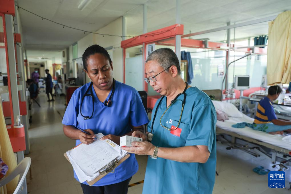 1月2日,在瓦努阿图维拉中心医院,中国援瓦努阿图医疗队队长、心血管内科医生陈牧雷(右)与当地医务人员交流。