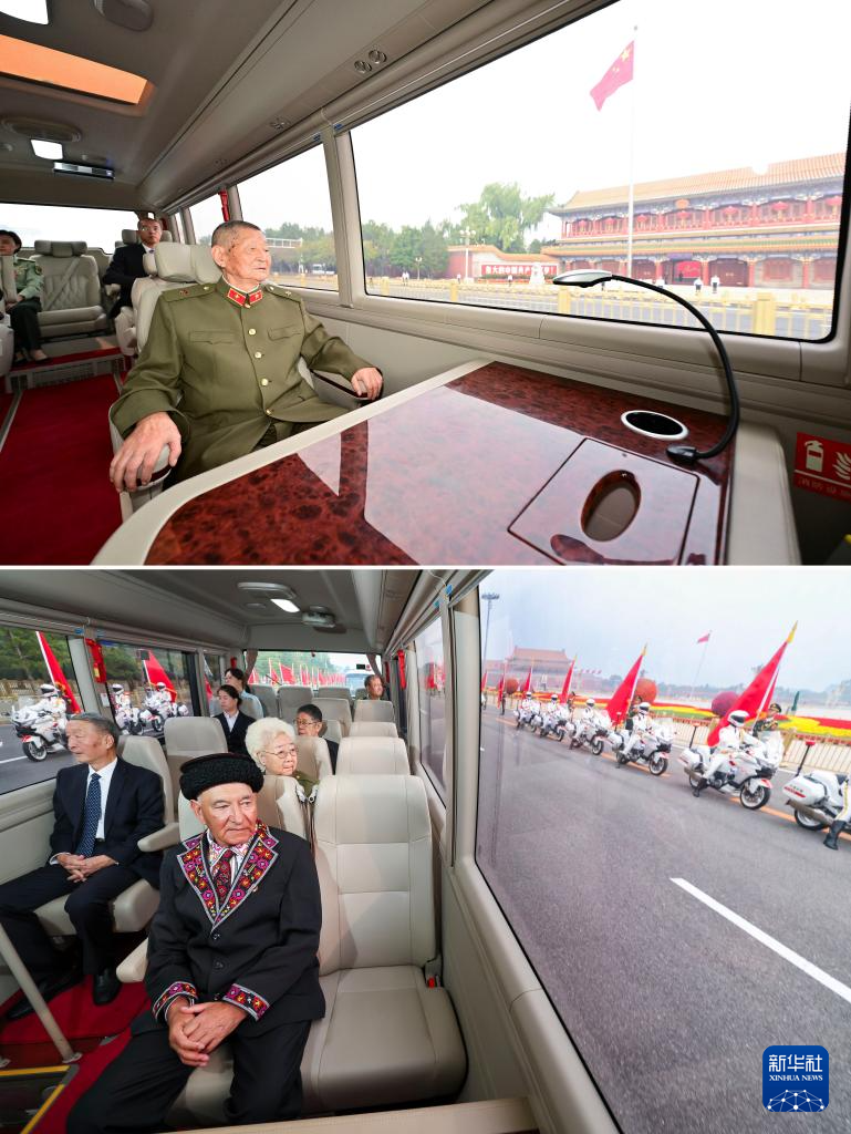 拼版照片:上图为“共和国勋章”获得者黄宗德乘坐礼宾车前往人民大会堂;下图为国家荣誉称号部分获得者乘坐礼宾车前往人民大会堂。